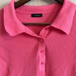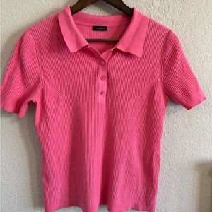 Bright pink polo top with ribbed texture. Short sleeves and classic collar. Ideal for casual outings.