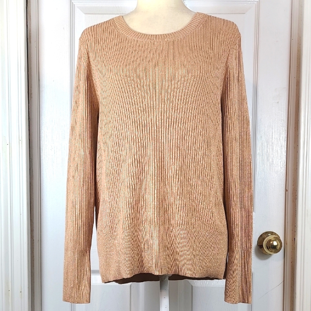 Long Sleeve, Rounded Neckline, Ribbed, Tan in Color With Metallic Gold Flecks, Stretchy and Soft, Size Large.