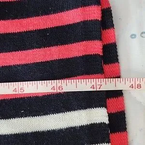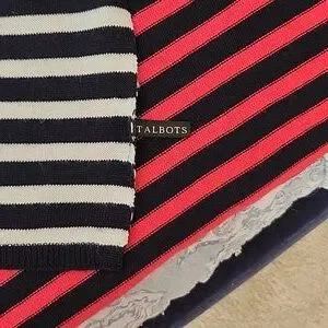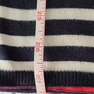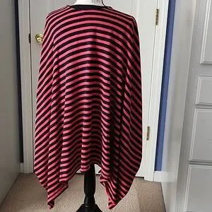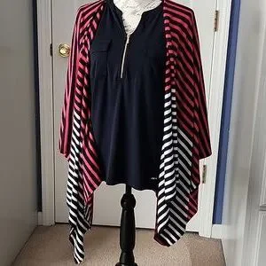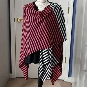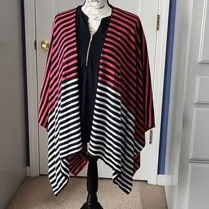 Cute and versatile ruana from Talbots. Light-weight knit, red, white, and dark navy stripes. Missing the cleaning instruction tag, but I believe I washed on delicate cycle and line dried. See photos for measurements. Barely pre-loved condition with no signs of wear. The Ellen Tracy top in photo for sale in separate listing.