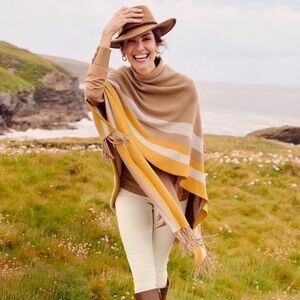 Stylish poncho with stripes and fringe. Features tan, yellow, and cream colors.