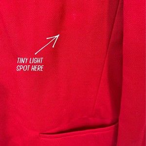 The jacket is in very good pre-owned condition. There is a very small, very light spot on the left front of the jacket, approx 6" above the pocket & 2" to the right of the left side front seam. The spot is located in an area that would likely be obscured by the sleeve of the jacket most of the time & is not very noticeable. (See 4th picture) There is also a faint stain on the right front side of the jacket, approx 3" below the button. It kind of looks like a shadow. (See 5th picture)