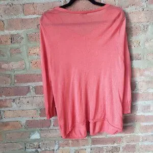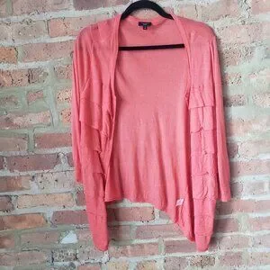 Keywords: cardigan, lightweight, layering, ruffle-front, waterfall front, tiered, coral, peach, classic, bright, preppy, colorful, plus size, knit, easter, spring