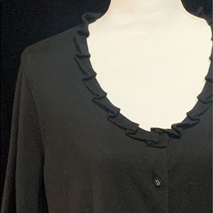 Pretty little short sleeve ruffle neck sweater. Two small pockets on front. Lightweight sweater material with covered buttons. Color is rich black; appears washed out in some pics due to lighting. No flaws, smoke free home. Approximate flat measurements in last pic.