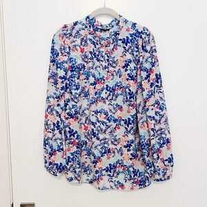 Talbots Ruffle Trim Popover Tunic in 100% polyester; machine wash. Pullover style with 6-buttons & loops at front, button cuffs, slightly puff sleeves with gentle gathered cuffs, front darts, slightly rounded hem. Approximate measurements: Pit-to-Pit laid flat 21”, Length 27”, Sleeves 24.5”. Non-smoking home.