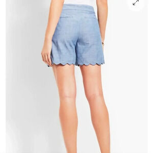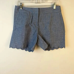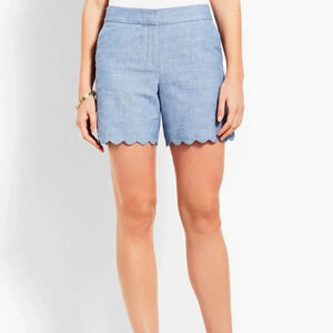 The sea is calling and we're hitting the beach in these stylish scallop-hem shorts. Chambray fabric gives a playful nautical feel to the polished and tailored shape. The 5-inch length is perfect for all your seasonal soires.