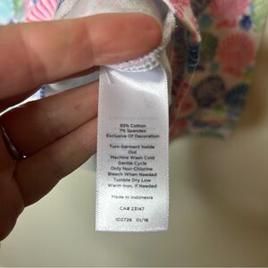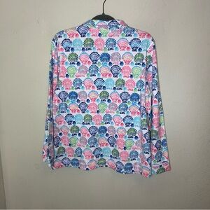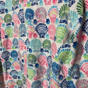 Cute resort wear style top. White background with blue and pink seashells. Lilly Pulitzer like. In very good used condition. Cotton/spandex blend. Size medium petite.