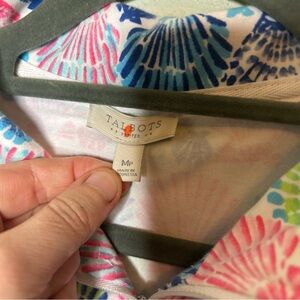 tags: Talbots, seashell print polo, half zip pullover, long sleeve top, size Medium Petite, women's casual wear, coastal style, nautical fashion, comfortable fit, lightweight sweater, spring fashion, beach-themed apparel, versatile layering piece, pre-owned women's top, stylish activewear, petite size medium, cotton blend pullover, vibrant seashell design, casual chic, resort wear