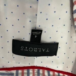 Talbots seersucker stripe patchwork blazer women. Color red white and blue. Size 4 Mybe fit size 6 look at the measurement please. Pit to pit 18” length 24 sleeve 21” . It has two pockets and two button. New tags are missing but two extra buttons hanging on the side label . It is fully lined.shall 100% cotton liner 100% polyester.