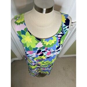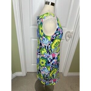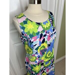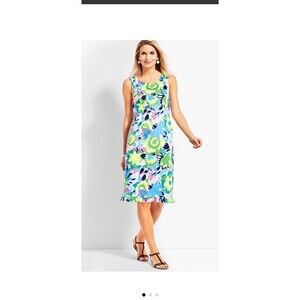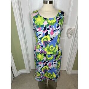 Talbots Sheath Dress 12 Island Tropical Floral Sateen Ruffle Hem Garden Casual. Pre-owned condition. No stains or holes. Pit to pit measures 19 length from center back 35. Comes from a smoke free environment .