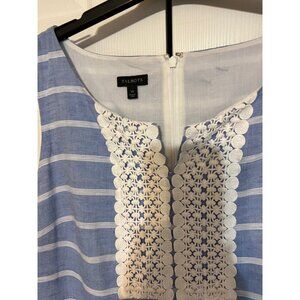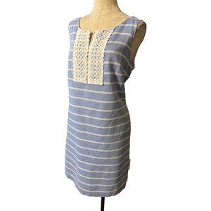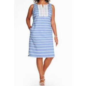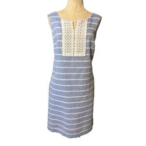 Talbots Sheath Dress 14 Blue White Cotton Linen Striped Embroidered Washable
