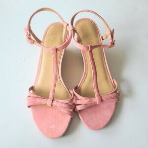 Talbots Royce Strappy Pink Genuine Leather Suede T-Strap Kitten Wedge Heel Sandals