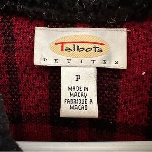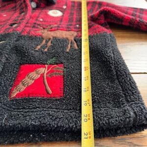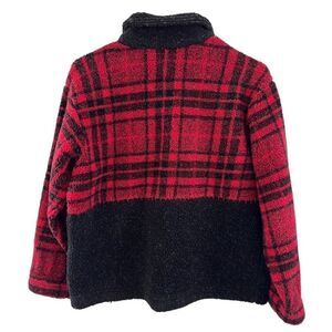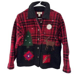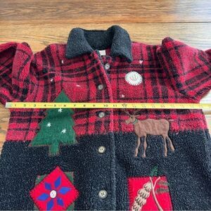 This Talbots Sherpa fleece jacket sweater is the perfect addition to your holiday wardrobe. Very warm and cozy with a beautiful red and black plaid design and holiday appliqué pattern. See photos for details and measurements.