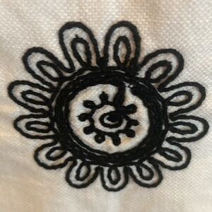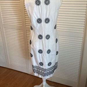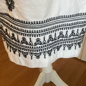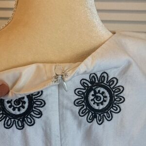 Beautiful embroidered black and white shift dress, slightly fitted. 100% cotton. Lining inside is 100% polyester. Measures from shoulder to hem, 39 inches. Necklace not included.