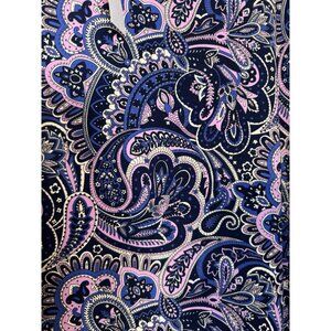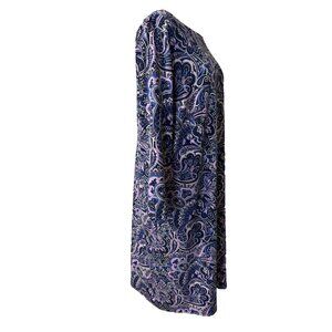 This pretty dress is from Talbot's in a misses size extra large. Paisley in pinks, blues, purples. Soft and stretchy, made of polyester and spandex. Machine washable. Pullover style with relaxed fit.