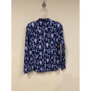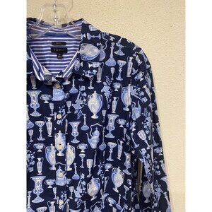 Talbots Shirt Womens 10 Navy Blue Non-Iron Porcelain Vase Print Button Front