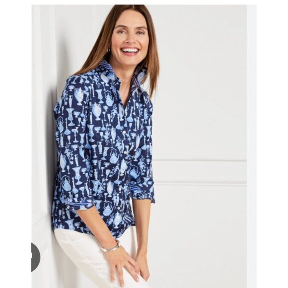 Talbots Shirt Womens 10 Navy Blue Non-Iron Porcelain Vase Print Button Front