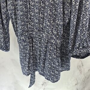 Talbots Shirt Womens Medium Blue White Wrap Printed Blouse Tie Navy 3/4 Sleeve