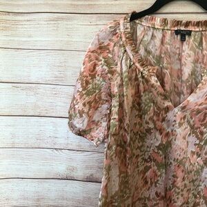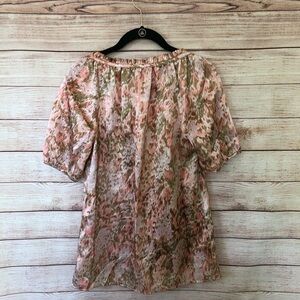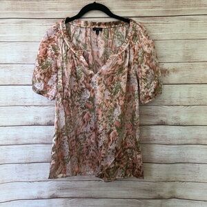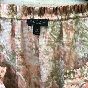 Size XS Short sleeves Coral, brown and pink printed blend Polyester Approximate Measurements: Underarms Across: 18" Length: 25"