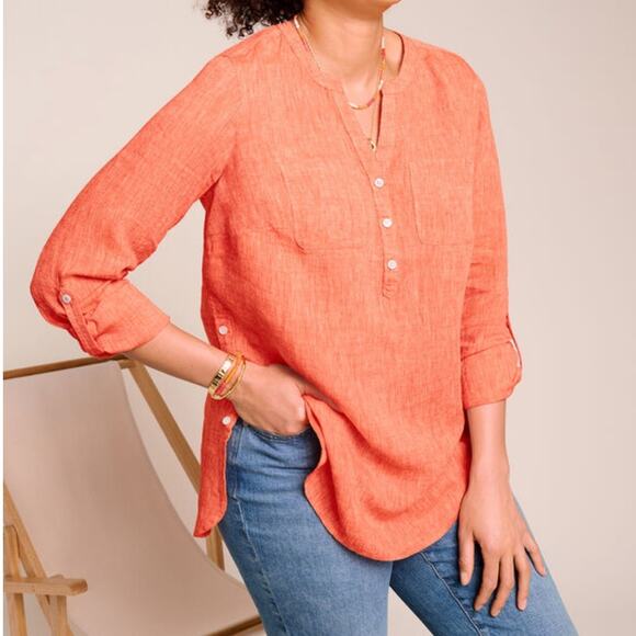 Talbots Side Button Linen Band Collar Popover Size Medium