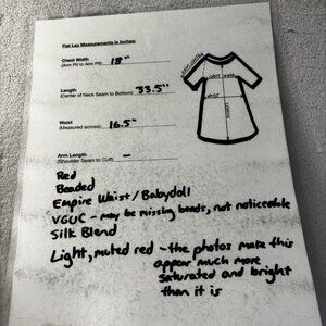Actual Measurements (per measurement card): Chest width 18 in, Length 33.5 in, Waist 16.5 in.