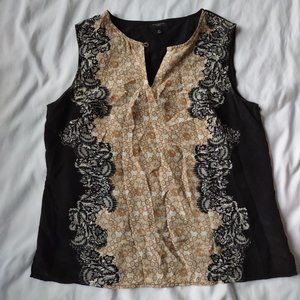 Talbots Top with key hole closure detail, 100% silk, black with cream/gold lace print