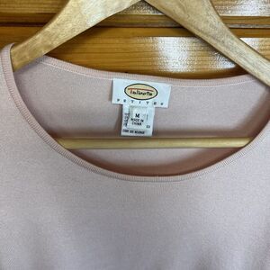This Talbots Silk Cashmere Long Sleeve Women's Pullover is a luxurious and stylish sweater designed for petite women in size PM. The sweater features a round neckline and tight-knit construction, with the cuffs adorned with pearls for a touch of elegance. Made from a blend of 70% silk, 15% nylon, 12% cashmere, and 3% spandex, this pullover offers comfort and sophistication in a beautiful pale pink color. Perfect for those looking for a high-quality and fashionable addition to their wardrobe.