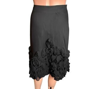 This Talbots black A-line midi skirt is silk with polyester chiffon rosettes around the bottom third. Fully lined with 97% polyester and 3% spandex, side zipper. Dry clean. Originally retailed for $179. This is a perfect skirt for a dressy occasion like a party, holiday gathering, wedding guest.