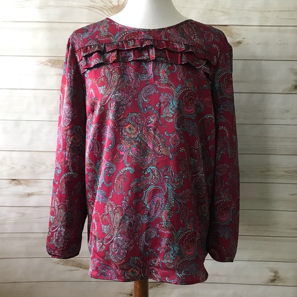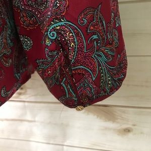 Gorgeous silk-like top from Talbots Petite. This is a beautiful lightweight top with a floral pattern and ruffle across the front. The back and ends of the arms also have a detailed keyhole button for closure. Size XLP. 100% polyester. Originally $85. Only worn once! This would be great for upcoming holiday parties!!