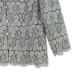 Features: crew neckline, button front closure, 3/4 sleeves, scalloped edge, fully lined, metallic silver floral lace.