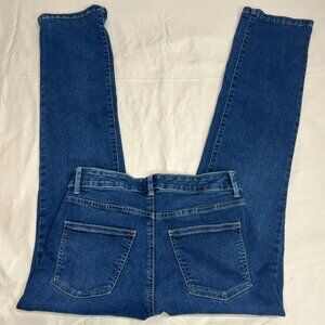 Preloved women's size 4P blue jeans from Talbots' "Simply Flattering" collection, designed with a curvy fit for a flattering and comfortable fit that eliminates back gap. Made with a comfortable stretch blend of 70% cotton, 9% rayon, and 2% spandex. Measurements: 14" waist, 9" rise, and 28.5" inseam. inv: 0203