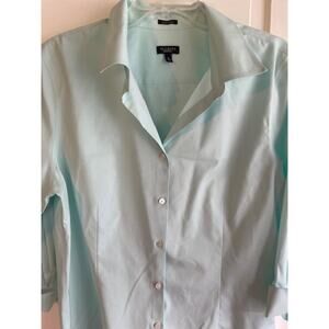 Talbot sophisticated light aqua button front shirt with 3/4 cuffed sleeves. It is 96% cotton / 4% Lastol. V-neck design.