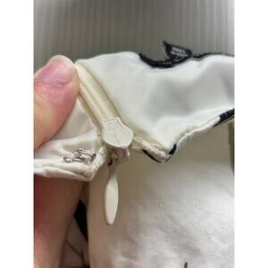 Missing the eye closure for the hook that near the zipper. But the zipper used by itself is fine. Also, there are a few pin size specks of stain (as shown). The waist tie is missing. Even though there are flaws, there is still a lot of life in this dress. See photos for details.