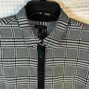 Talbots Size Large Top Popover Blouse Button Roll Tab Black White Houndstooth