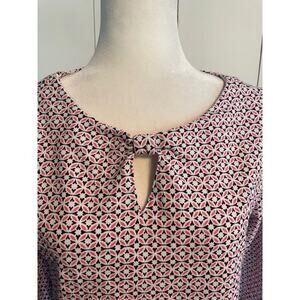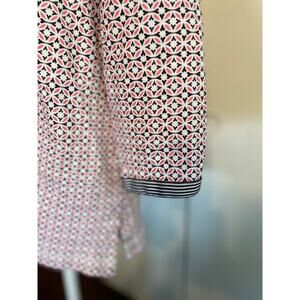 Talbots pullover knit top in a 100% cotton fabric. It is a scoop neck with a keyhole. Sleeves are 3/4 and have a striped border on the cuff. Pink, black and white pattern
