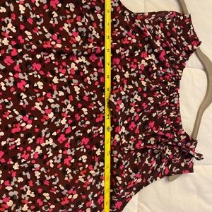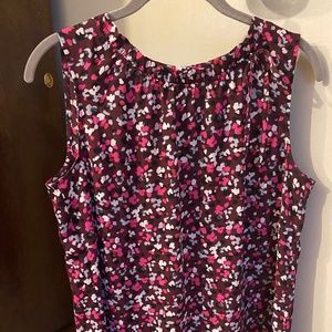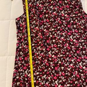 Very pretty patterned sleeveless polyester blouse from Talbots. Easy to wear on its own or under a sweater or blazer. Super cute. Colors are burgundy background with white, light grey, black and pink design.