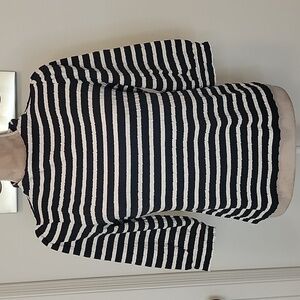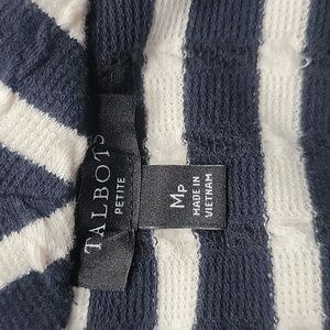 Talbots Size PM, Navy Blue And Ivory Striped, Mock Neck, Puff Sleeves, EUC