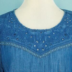 Talbots Size XL Blue Chambray Embroidered Crew Scoop Neck Long Sleeve Tencel Top