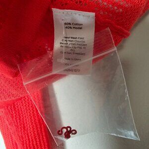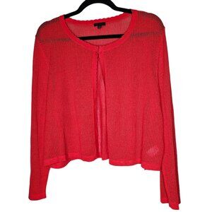 Bright orangey pink loose knit lightweight cardigan. Clasps at neck. Scallop trim.