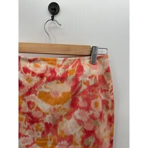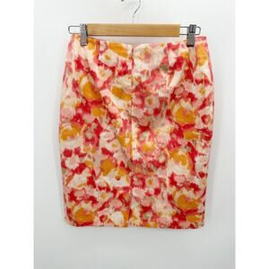 Orange, pink, and white printed pencil skirt. Lined, back zipper closure, hook and eye closure.