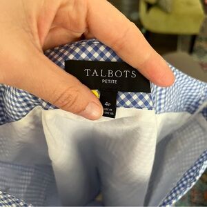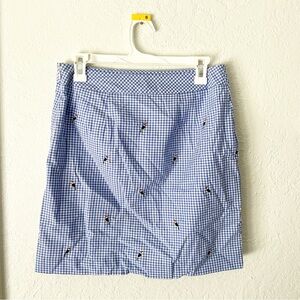 DETAILS: Talbots skirts women's 4P Petite, gingham cotton canvas skirt in blue and white checks, embroidered parrots, side zip closure. Cotton, machine wash.