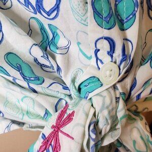 This Talbots blouse succinctly marries casual charm with a dash of playful elegance. Crafted from a cotton blend, the sleeveless design is perfect for warm weather, while the tie-front feature adds a contemporary twist. The all-over flip-flop print injects a fun element, making it a delightful choice for casual outings or leisurely days.