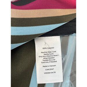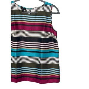 Classic and versatile, this Talbots sleeveless satin blouse in a bold striped pattern features rich shades of blue, green, pink, and black. Perfect for layering under a blazer for the office or pairing with tailored pants for a polished look. Smooth satin finish offers an elegant drape with a lightweight feel.