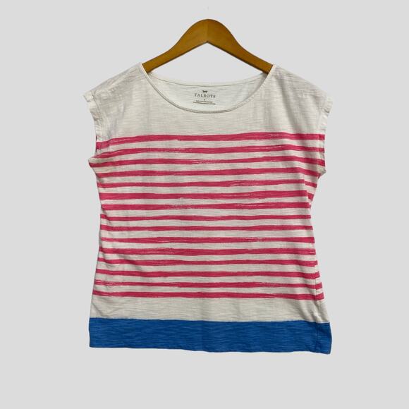In great preowned condition. Some wear throughout. Actual item for sale photographed, please see photos for details, flaws and measurements. Talbots Sleeveless Top Women's Small White Striped Round Neck Shirt 100% Cotton