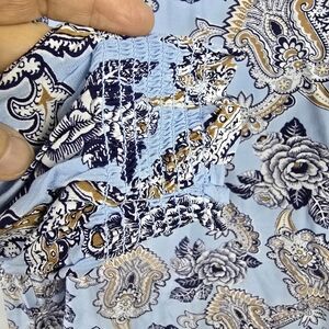 Our feminine top in a medallion rose print features a flattering split neck and pretty smocking at the sleeve cuffs. There is a light spot on the back of the blouse. Check pics.