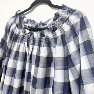 Talbots Smocked Top 1X Tinsel Tartan Plaid Blue White Gold 3/4 Sleeve Plus Size