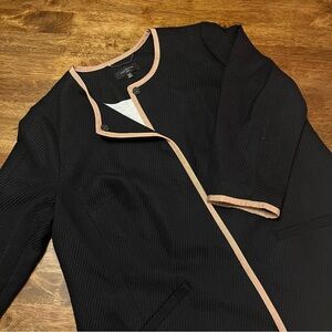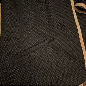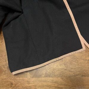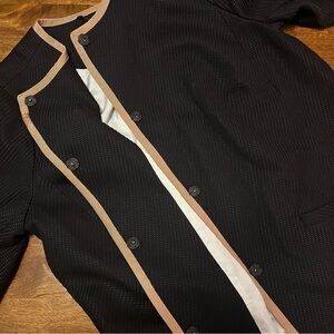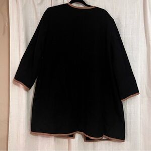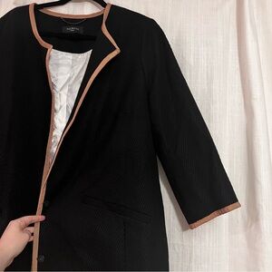Chic black coat jacket with tan accents. Perfect for versatile styling. Snap up buttons, pockets are not functional from what I could tell or are sewn shut. Gives a quiet luxury feel. Perfect wardrobe staple for fall, winter, and spring. luxurious material.