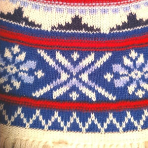 Pretty warm Talbot's Snowflake Sweater with a lambs wool blend. Cream red and blues with a tiny fringe detail. Snowflakes knitted along the neckline, very cute. Order it today 🙂❤️👍.