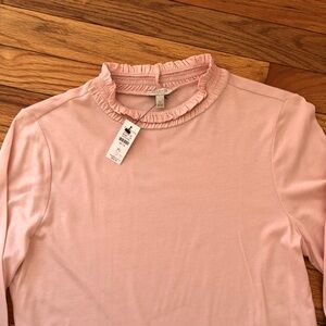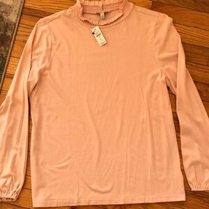 Chic Talbots blouse in soft pink. Features a delicate ruffled neckline. Ideal for a stylish look.
