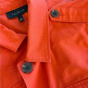 Fantastic Spring Jacket; gorgeous orange color! There are 5 tortoise shell buttons down the front; one on each shoulder and on each sleeve and all 4 front pockets have a hidden button closure. Excellent condition! Super fun color!