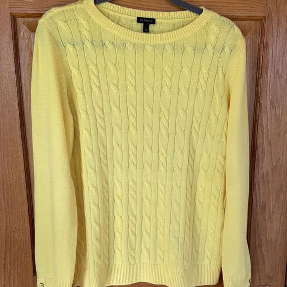 Talbots cable knit sweater. Bright springtime yellow. This is lightweight and perfect for spring. cable knit front and back with plain sleeves with 3 buttons on cuff to dress it up. Size large measures 20 1/2” armpit to armpit and 26” shoulder to hem. Very nice condition - no pilling. Only worn once.